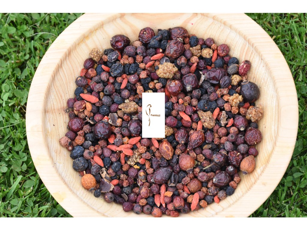11. Směs bobulí - sušených plodů (hloh, aronie, šípek, rybíz, bez, rakytník, rohovník, kustovnice (goji),...aj