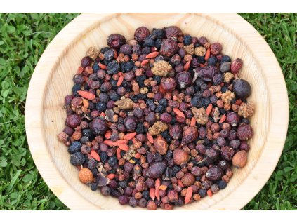 Směs sušených plodů a bobulí BEZ CUKRU/BARVIV/SO2 - vyrobeno ze surovin v potravinářské kvalitě. DÁVKOVÁNÍ dle chuti. Uchovejte v chladu a v temnu. Bobule podávejte sušené...